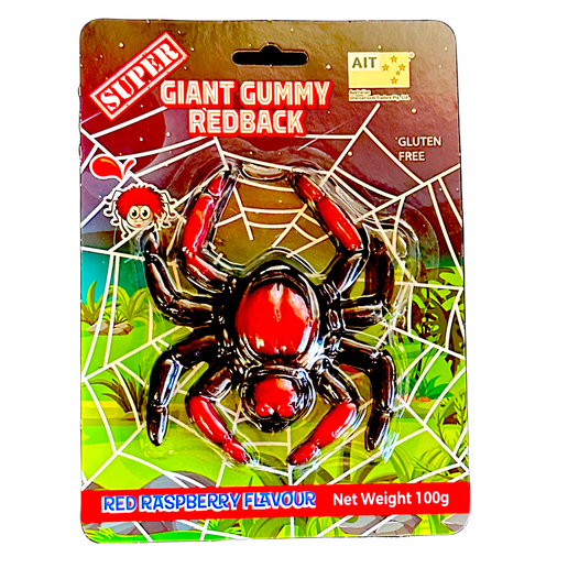 A super sized Red Raspberry flavoured giant gummy redback spider. Gluten free