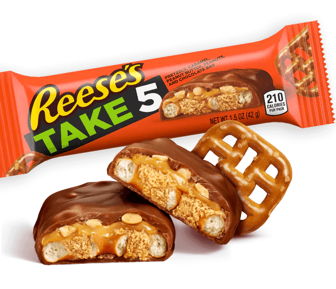 The TAKE 5 Bar is five layers of sweet and salty goodness that doesn't ask you to compromise. It's crunchy pretzels, smooth peanut butter, salty peanuts and sweet caramel—all covered in a chocolaty coating. Grab this snack the next time you want to mix things up.